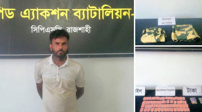 স্টাফ রিপোর্টার : রাজশাহী সীমান্ত দিয়ে মাদক পাচারকারী এক ব্যক্তিকে বিএসএফ’র পোশাকসহ আটক করেছেন র‌্যাব-৫ এর সদস্যরা। ওই ব্যক্তি মাদক চোরাচালানের সময় ভারতীয় সীমান্তরক্ষী বাহিনীর (বিএসএফ) পোশাক পরে সীমান্ত এলাকায়