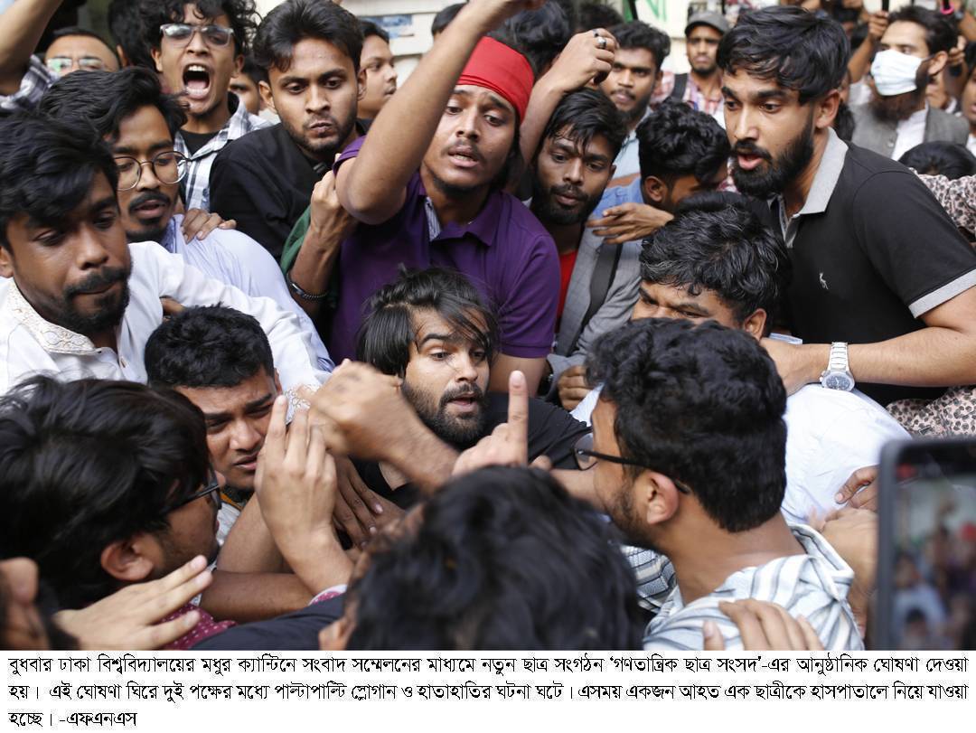 ঢাকা বিশ্ববিদ্যালয়ের মধুর ক্যান্টিনে আয়োজিত সংবাদ সম্মেলনের মাধ্যমে বুধবার (২৬ ফেব্রুয়ারি) বিকেলে নতুন ছাত্র সংগঠন ‘গণতান্ত্রিক ছাত্র সংসদ’-এর আনুষ্ঠানিক ঘোষণা দেওয়া হয়। সংগঠনটির কেন্দ্রীয় আহ্বায়ক হিসেবে দায়িত্ব পেয়েছেন আবু বাকের মজুমদার এবং সদস্যসচিব হিসেবে রয়েছেন জাহিদ আহসান। তবে এই ঘোষণাকে ঘিরে বিভিন্ন পক্ষের মধ্যে উত্তেজনা দেখা দেয় এবং একাধিকবার হাতাহাতির ঘটনা ঘটে। বিকেল ৩টায় সংবাদ সম্মেলন শুরু হওয়ার কথা থাকলেও কিছুটা বিলম্বে বিকেল ৪টার দিকে বৈষম্যবিরোধী ছাত্র আন্দোলনের সাবেক সমন্বয়করা মধুর ক্যান্টিনে উপস্থিত হন। এ সময় বেসরকারি বিশ্ববিদ্যালয়ের একদল শিক্ষার্থী সংগঠনের কেন্দ্রীয় কমিটিতে নিজেদের পর্যাপ্ত সংখ্যক পদ দাবি করে বিক্ষোভ করেন। দুই পক্ষের মধ্যে উত্তেজনা বাড়তে থাকলে একপর্যায়ে হাতাহাতির ঘটনা ঘটে। সংবাদ সম্মেলনের সময় সংগঠনের কেন্দ্রীয় কমিটির নাম ঘোষণা করা হয়। মুখ্য সংগঠক হিসেবে তাহমিদ আল মুদাসসির চৌধুরী, মুখপাত্র হিসেবে আশরেফা খাতুন, সিনিয়র যুগ্ম আহ্বায়ক হিসেবে তৌহিদ মোহাম্মদ সিয়াম এবং সিনিয়র সদস্যসচিব হিসেবে রিফাত রশীদ দায়িত্ব পেয়েছেন। ঢাকা বিশ্ববিদ্যালয় শাখায় আহ্বায়ক করা হয়েছে আবদুল কাদেরকে এবং সদস্যসচিব হয়েছেন মহির আলম। এছাড়া মুখ্য সংগঠক হয়েছেন হাসিব আল ইসলাম এবং মুখপাত্র হিসেবে দায়িত্ব পেয়েছেন রাফিয়া রেহনুমা হৃদি। সংবাদ সম্মেলনের আগে থেকেই নতুন কমিটিতে কারা থাকবেন, তা নিয়ে বিতর্ক চলছিল। বিকেল ৪টার পরে নতুন কমিটির ঘোষণা আসার পর কিছু শিক্ষার্থী এই সিদ্ধান্তের বিরোধিতা করে স্লোগান দেন। তাঁরা দাবি করেন, নির্দিষ্ট কয়েকজন নেতাকে বাদ দিয়ে কমিটি গঠন করা হয়েছে, যা বৈষম্যমূলক। এসময় ‘রিফাত রশিদের ভয় নাই, রাজপথ ছাড়ি নাই’ এবং ‘আমার সোনার বাংলায়, বৈষম্যের ঠাঁই নাই’- এমন স্লোগান দিতে দেখা যায় বিক্ষোভকারীদের। এক পর্যায়ে দুই পক্ষের মধ্যে ধাক্কাধাক্কি এবং হাতাহাতির ঘটনা ঘটে। প্রত্যক্ষদর্শীরা জানান, সংঘর্ষের ফলে কয়েকজন আহত হয়েছেন, তবে তাঁদের নাম-পরিচয় তাৎক্ষণিকভাবে জানা যায়নি।